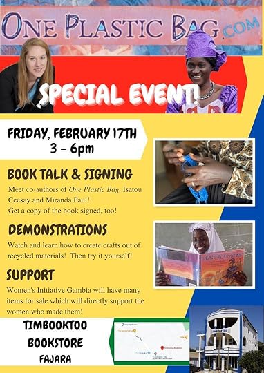 Please join us for the opening event, a book launch and autographing party at Timbooktoo Bookstore in Fajara, Gambia! (3 Garba Jahumpa Road; Bakau New Town, Fajara M Section.) The event will be held on Friday, February 17th from 3:00-6:00 p.m. Meet and greet with Miranda Paul, environmentalist Isatou Ceesay, and watch live recycling demonstrations with the volunteers from Women’s Initiative the Gambia. Autographed books will be available for purchase and light refreshments will be served. Join the party of the decade! We hope to see you there.