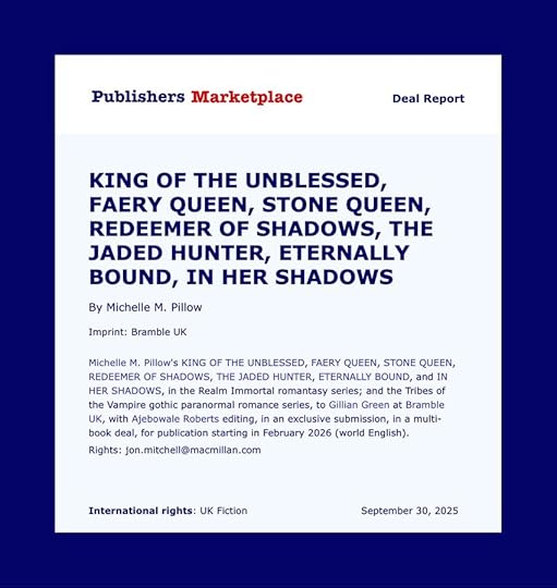![]() I just announced this, but it's in Publisher's Marketplace!! Isn't it pretty? It makes it look all official ❤ Realm Immortal (high fantasy romance) Tribes of the Vampire series (urban fantasy romance) I just signed a contract with Pan Macmillan Tor/Bramble for new pretty print editions, audiobooks, and translations for 7 books. |