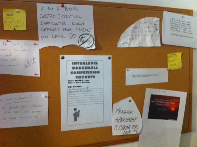 Other than strange noises and smells coming from below, the only sign of the other residents were the occasional note they left each other on this pin-board.