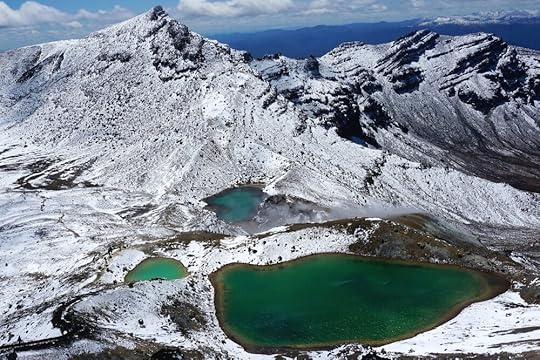 From the top, the view of the surrounding peaks is sensational. A large sign cautions visitors that they are in a hazardous volcanic area. This seemed to be a bit late in the game to be informed of such a detail. Steam vents make the visibility foggy and leave the air stinking of sulfur. Below, the trail dives sharply down a very steep pitch toward the beautiful green Emerald Lakes, the highlight of the Crossing and a photo you see in many New Zealand guidebooks. The lakes fill explosion craters and get their eye-catching colors from dissolved minerals that have washed down from the thermal area near Red Crater. On this day, the contrasting freshly fallen snow framed the lakes. Thick dark volcanic soil made the footing challenging and several people took spills as they made their way down the hill. Again, more amusement ensued.