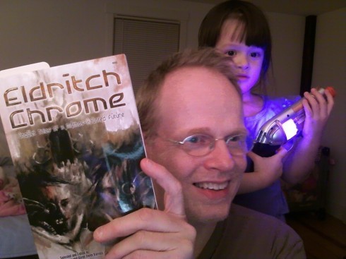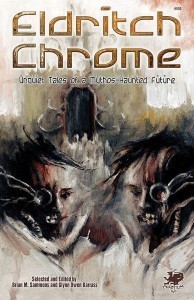 Today I received my contributor’s copies of the new anthology ELDRITCH CHROME, edited by Brian M. Sammons and Glynn Owen Barrass. This book is especially important to me because it marks my first appearance in a title published by Chaosium, representing a real dream come true. Oh, how I envied those who appeared in the Chaosium books I encountered over the years…envied and despised them! Now others can despise me…HA! Happy to report, I’ll appear in several more Chaosium anthologies, forthcoming. (HA, I say!) This one, of course, has a theme of Lovecraftian cyberpunk, and appropriately enough my story herein — “Open Minded” — is set in my notorious far-future world of Punktown.