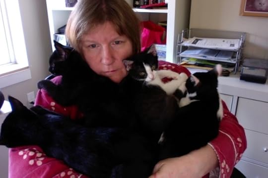 As people who follow my Facebook page know, I volunteer in cat rescue. (This is a photo of me trying to read the morning’s emails while the Wild Bunch, one of my foster litters last year, make themselves comfortable.)
