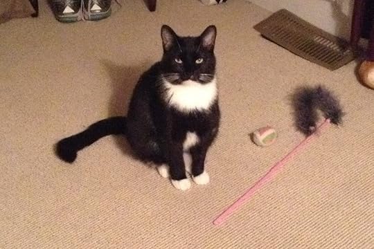 Then, although I had only planned to adopt two cats, I got interested in another cat fostering with C.A.T. who was so pathologically shy he had little chance of being adopted, Poe. For whatever reason, I felt like this was the right home for him and adopted him, too. It took more than a month for Poe’s foster mom to catch him (though he lived inside her house) so she could transport him here, and it was another month before he would even let me see him. A friend asked during that time how I knew he was still alive, and I said, “Because I haven’t found his body.” Poe now allows me to see him regularly, and I am once in a while even allowed to pet him (briefly); but no one else ever sees him—to the extent that my father refers to him as my “fictional” cat.