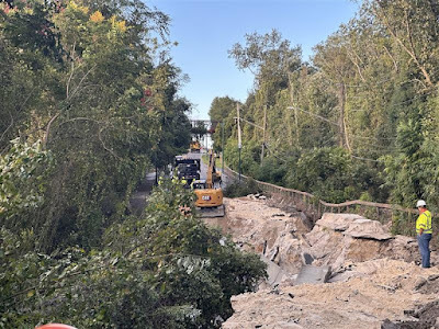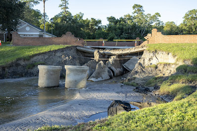 Being a newshound, I always start the day with the TV news accompanying my coffee. And that's when I learned what Seminole County escaped on Sunday night. My eyes popped as I saw a pic of a severely washed-out road—maybe 50 yards of destruction—a white Honda in the stream-bed on top of the chunks of concrete from the destroyed bridge. It took most of Monday for the whole story to unfold. Two bursts of rain (15-19" in a matter of hours) occurred c. 50 miles apart. One in Lake County, the other in Brevard County (home of the Space Coast). Roads and backyards washed out, homes flooded—the damage as bad as if a hurricane had swept through—except it was just in those two spots. (Estimated time of Mt Dora bridge replacement: one year.) All local TV channels reporting stories of flooded homes, homes now teetering on the edge of twenty-foot cliffs, pics of furniture, even refrigerators being carted out to the street. People kayaking down flooded streets . . .