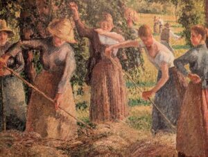 Just to be safe, I thought I’d better start taking in some of those art galleries before they are turned into a 21st century equivalent of a rubber factory, like say a Presidential ballroom. Not too long ago I found myself entranced for a deeply pleasing, contemplative moment by a scene of several robust French women wielding hayforks, some resting from their farm toils or removing extra layers of clothing on a warm summer day. Their long skirts are like drapery, hems touching the ground, and their blouses, while loose and functional, appreciatively reveal their feminine curves. My muscles strain in sympathy with their harvest labor, even as their figures and the textures of their clothing blend with the land, trees, and a distant field hand or two. The bright colors of their clothing mirror the hot flush in their fleshy cheeks, indeed the vibrant health of their physiques and choregraphed nature of their movements compose a scene of easy harmony with nature.