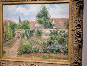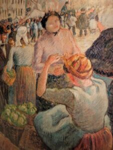 of larger fields tended by vigorous women, to gardens whose cabbages and gardeners appear rooted to the same earth, to the village marketplace where Pissarro’s frames were filled with an abundance of produce and jostling bodies, I experienced a revelation: I was viewing what might be the first artistic portrayal of a local food system! I could barely contain my joy amidst the hubbub of art lovers, most of whose thoughts of food were limited to the approaching lunch hour and the draw of the DAM’s hip cafes.