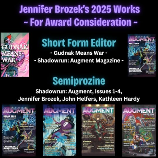 Blog: My Awards Eligibility Post for 2025. TL;DR Best Editor Short Form: Jennifer Brozek, and Best Semiprozine: Augment Magazine by Jennifer Brozek, John Helfers, and Kathleen Hardy.
