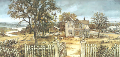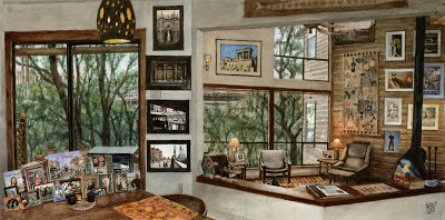 JANICE:  For Christmas Tom gave me his painting called, "Our World." In amazing detail it shows our living and dining room with many paintings and drawings by Tom, our sons Karl and Daniel, Tom's mother, a needlepoint tapestry by me of our sons' childhood drawings, and family photographs on our dining table shrine. This is our magical tree house.