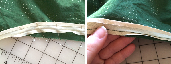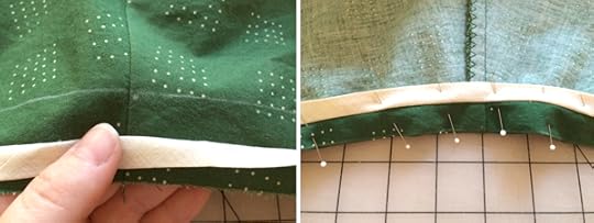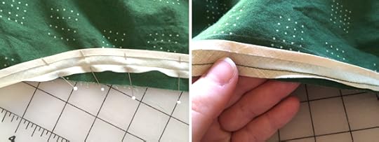 Step 3- Before you roll the binding to the inside, I marked the fold line on the right side of the dress with water soluble pencil so I could roll that to the inside after I sewed the binding on. Step 4- fold on the fold line, and pin in place. This will taper to the edge of the fabric.