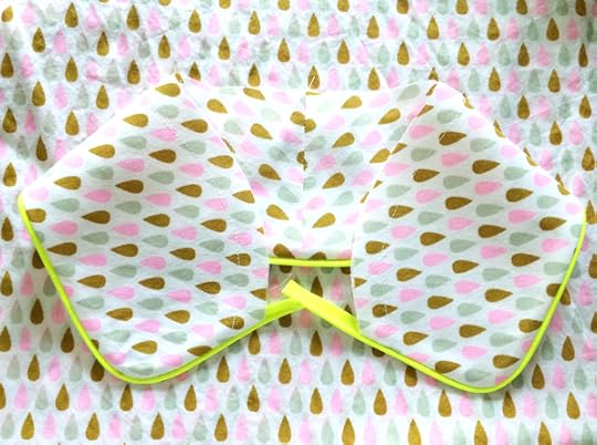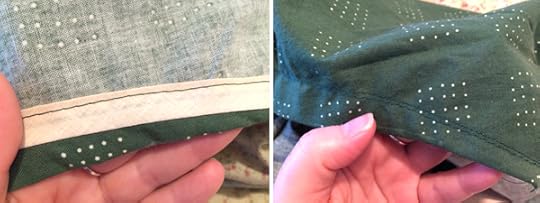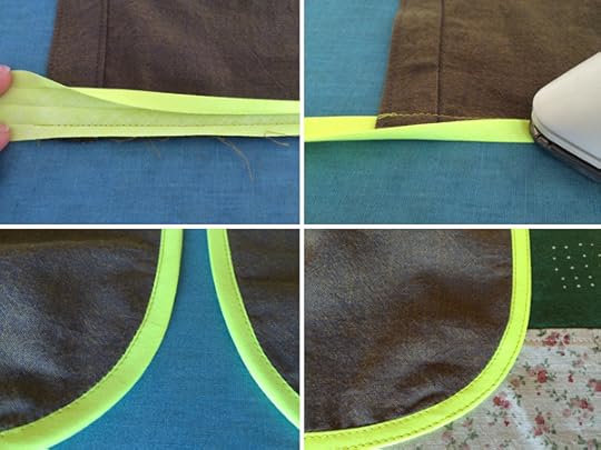 The first change was how I attached the binding to the pockets. As pictured above, the patch pockets are trimmed in 1/4" double fold bias binding. The instructions have you sandwich the binding on the edge of the pocket, baste it in place, then sew them in place close to the inner edge of the binding. I didn't do them this way for two reasons. First, this would mean that the distance from the inside of the binding to the edge would be like a flap, so if you go this way you might want to do another row of stitching at the actual pocket edge. And second, I prefer to sew my binding around like a wrap instead of a sandwich.