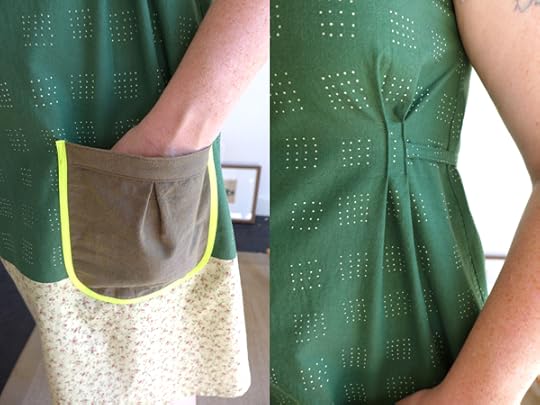 The front features the signature Dottie Angel pleated pockets that are set on top of the optional contrast band at the bottom. The length is a midi length, meant to hit mid-calf. The sleeves are kimono sleeves that are formed in the shoulder seams, so there are no actual sleeves to put on.