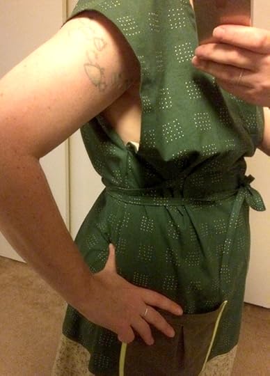 If you're not familiar with the garment, the front features two top stitched pleats on the left and right of center, which have a tie sewn into them that wraps around to the back to cinch in the back of the dress. I found my tie was plenty long to wrap around to the front to place the bow in the front if I wanted to, but I liked it best in the back.