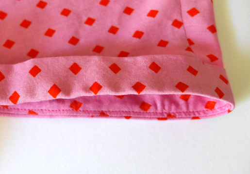 I did my pocket binding as pictured above. Step 1- sew the binding to the right side of the pocket, stitching in the first fold. Step 2- wrap the binding to the wrong side, pressing it to the edge of the stitching. Step 3- stitch the binding in place at the inner edge. Step 4- then sew the pockets to the dress at the outer edge of the binding.