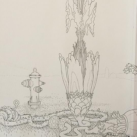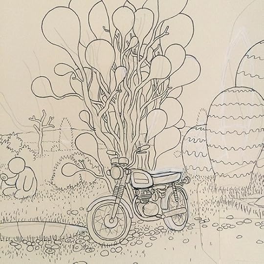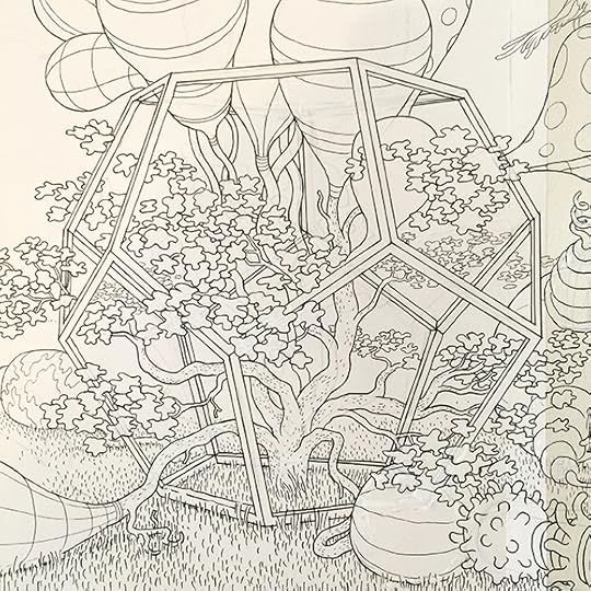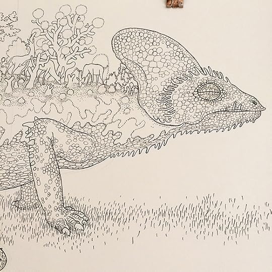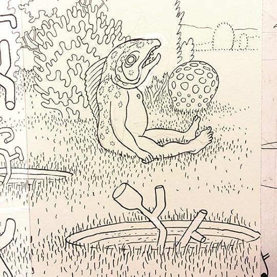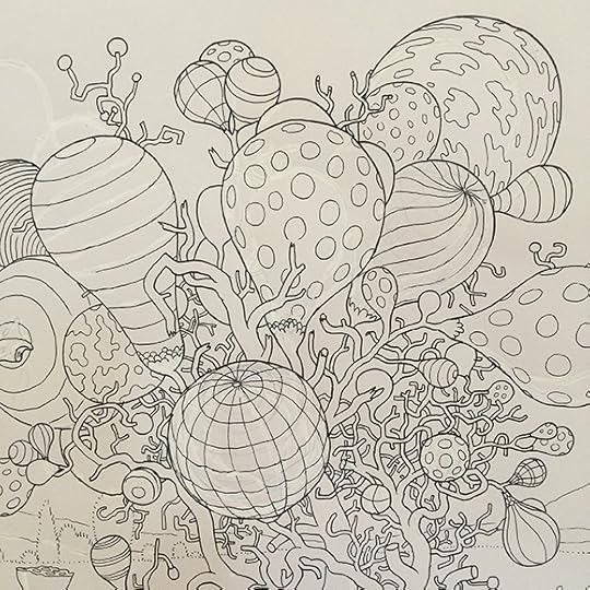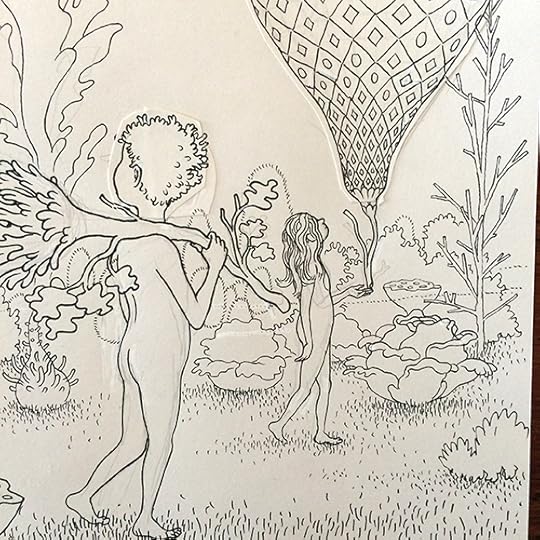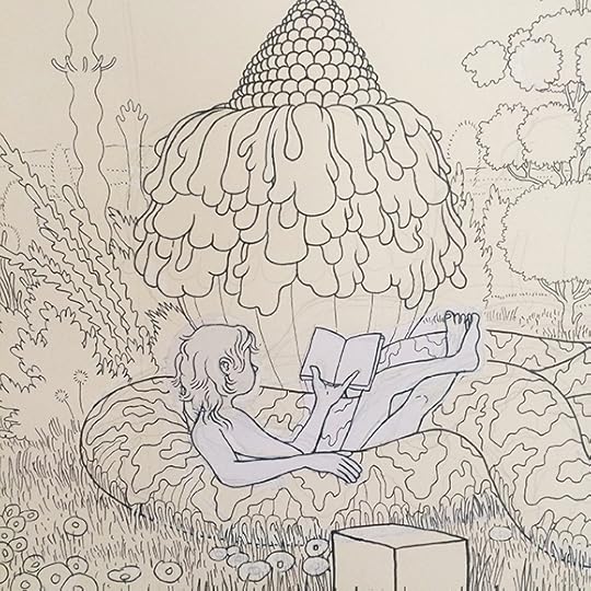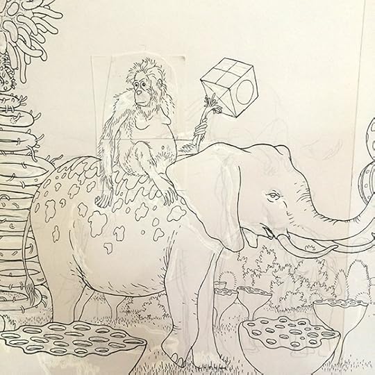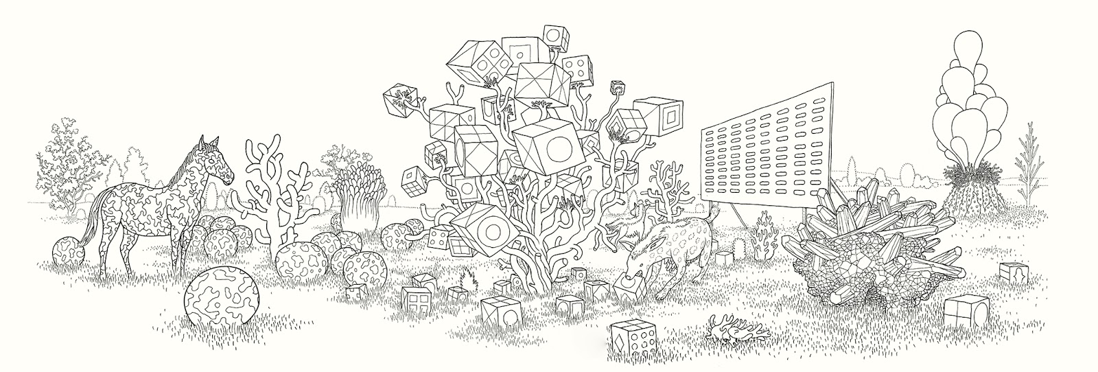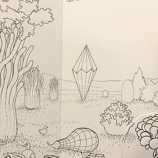 I'll post more about this when the book is released next Fall, but I spent the last several months working on a coloring book titled A Walk in Eden, finally turning in the final files last week. It was originally commissioned by Ginkgo Press in Beijing and will be released in North America by Drawn & Quarterly. It loosely follows some of the other Garden of Eden drawings I've done in the last few years and shares a (secret sub)title with that of another large drawing I did in 2012... so yes, there is a very loose narrative to it. Most of the actual drawings comprise ten-to-fifteen page continuous panoramas. A gatefold in the middle showcases a few of these, but the rest of the book is, of course, necessarily made up of two-page spreads. A few of the original landscape drawings, in all their white-ink/cut-and-paste-y glory, are on view now as part of a special two-person show called
