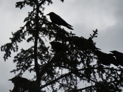 I watched a murder of crows congregate in a spruce tree across the street, cawing to call others to join them. Another group cawed back from a block away. “No, no, our group is better. Come here, come here.”