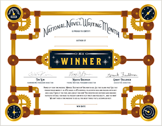 I did it! I wrote 50,097 words in 29 days. It is a wonderful feeling of accomplishment. I know that it is only a fraction of the work that's going into this book but it feels good. After a brief respite for the holidays, I will be back at it to finish Marabella's series.