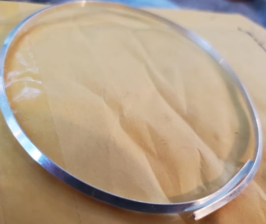 To complete the bottom piece I went to the craft store and bought some soft aluminum strips intended for bracelets and cut them to shape, and got some brass ribbon as well.