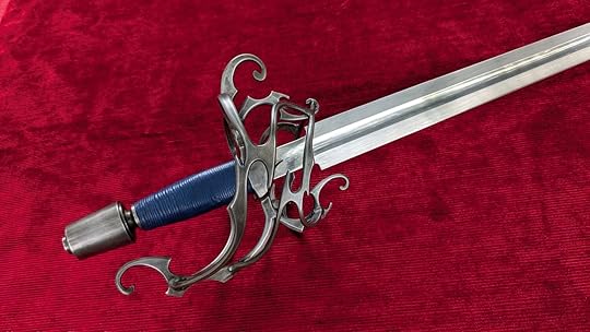 Recently (actually last year; I’m just too lazy to post often) I commissioned Jesse Belsky to make a new hilt for it, and this is what came back. Jesse mostly does custom work for weddings, graduations and other events, sometimes fencers or stage and film production. This guard design pops up a lot on his site and I really liked it, especially cause it’s ambidextrous so lefties can wield it. It feels even better in the hand than the original did, and there’s no apparent change in balance or anything. This is actually a plainer version compared to the incredible designs he usually does, but it’s still way fancier that anything else I own, so I’m very pleased with it! His pictures are much better than mine, so I’ll just link to his: