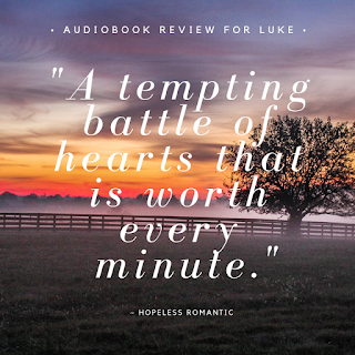 My tour for Luke's audiobook starts today and I'm so excited! And adding to my excitement is this awesome review posted on the Hopeless Romantic blog--5 stars, y'all!. My narrator Tiffany Williams did such an amazing job bringing these characters to life, and I hope you guys will definitely check it out. Be sure to let us know if you do!