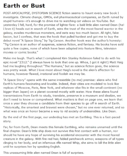 "This was an amazing romp in a creative space universe! I felt a link to the alien "Dean" from the very beginning, and it only intensified the more I read."