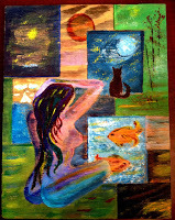 Well NanoWrimo (National Novel Writing Month) is here and I rose early to get my wordcount done (1773 done). I could write more and will probably do so later in the day, but I've been sidetracked. What is it about me, that I've barely touched a paintbrush, pencil or pen to draw or paint all summer long. I blame my ennui on the sweltering summer heat. But now on this cool rainy Sunday with the Nano challenge of writing 50,000 words before me I'm working on unfinished paintings.Madness to dilute my time in one of the socially busiest months of my year. What can I say. Here are 4 that are finally ready to post to Etsy unless they disappear via Blog. Acryllic, pencil and/or pen on rescued (I gather wood from construction sites and upcycle it and lessen the burden on our burgeoning waste)