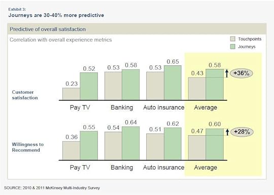 “Customer Journeys are consistently better predictors of value. They do a better job than the touchpoint approach of predicting a customer’s willingness to recommend the company to others or to renew their business.” (See exhibit below)