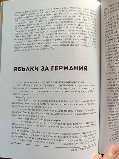 – Ооо бабо, не започвай пак! – ядоса се по детски внучката, едва не тропна с крак. – Да да, знаем, колко много татко е обичал мама! И тая история съм я чувала. Като я е обичал толкова, защо не е останал с нея в Германия? Защо не е пожелал да живеят по-добър живот? Не само това, ами даже от София се е върнал обратно в това задръстено село накрай света, за да копае градината и да бере ябълки.