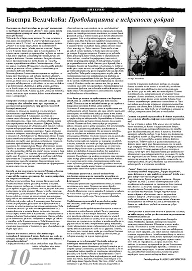 Интервю с Бистра Величков за в. „Литературен вестник“, бр. 10, 13-19.03.2024 г.* Интервюто е публикувано във в. „Литературен вестник“, бр. 10, 13-19.03.2024 г., с. 10