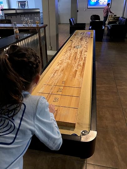 After her team whooped the competition, I taught her shuffleboard wherein she whooped me. Darn her fantastic hand-eye coordination.