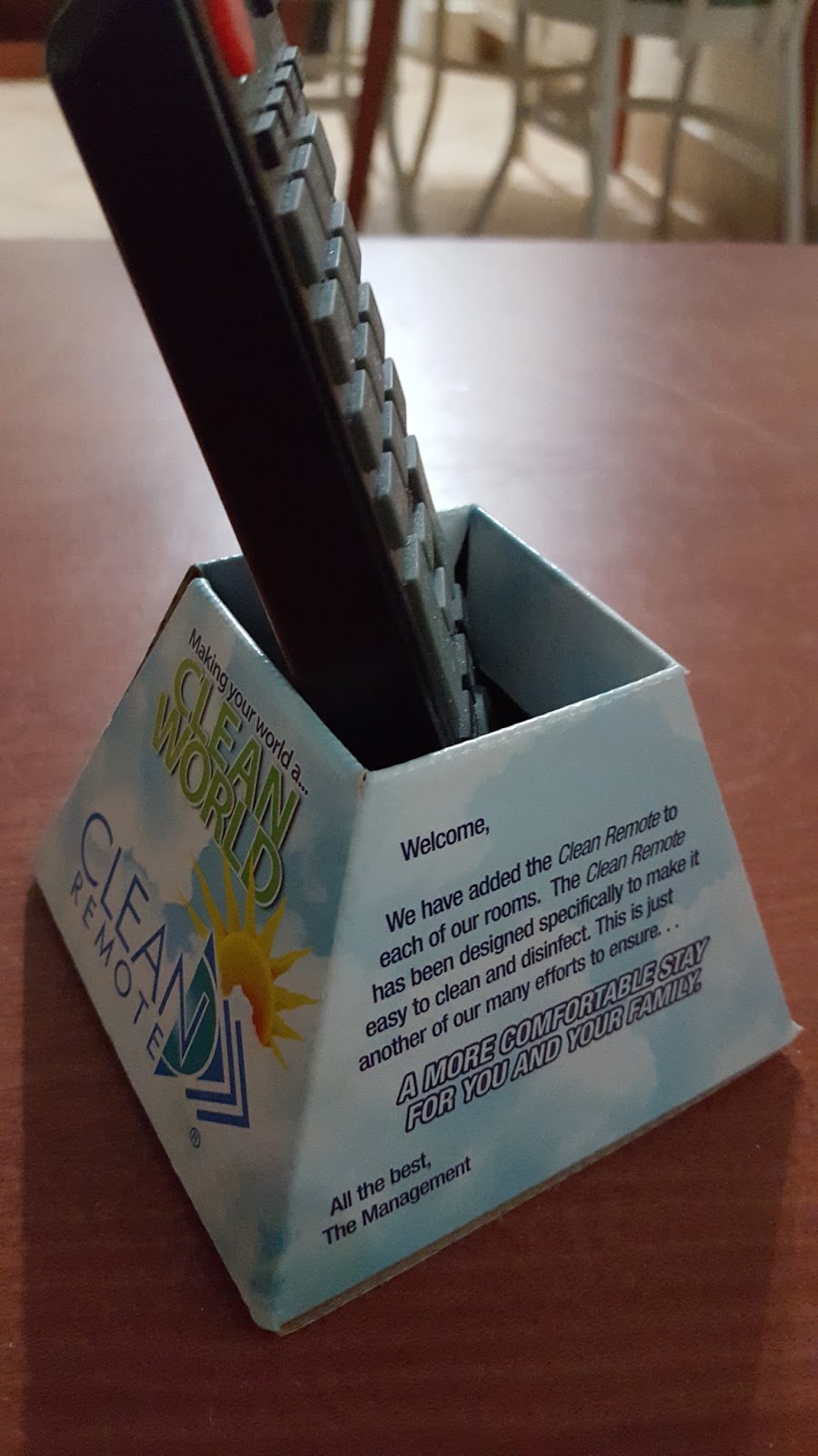 As the sign promises, "Making your world a CLEAN WORLD. The CLEAN REMOTE has been designed specifically to make it easy to clean and disinfect. This is just another of our many efforts to ensure ... A MORE COMFORTABLE STAY FOR YOU AND YOUR FAMILY."