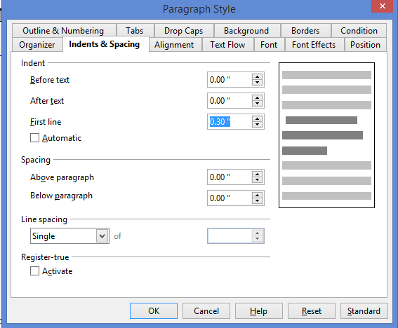 On the "Indents and Spacing" tab, you'll want to specify that the first line is indented by either 0.3 inches or 0.5 inches. Either is acceptable. In the "Alignment" tab, choose "Justified." In the "Text Flow" tab, make sure "Keep with next paragraph" is unclicked. Click "OK" and apply.