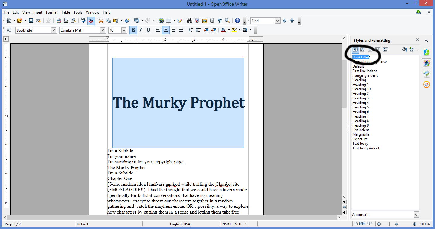 NOTE: If you end up with a massive amount of space between your title and subtitle, you can fix this by highlighting the title, right clicking the Style, hitting "Modify," and adjusting "Line Spacing" under the "Indents and Spacing" tab. If you notice, in the previous picture, there's two inches of space beneath "The Murky Prophet." While I didn't specify space beneath the Style, it's there. I just adjusted the "Line Spacing" to "Fixed" and specified 1 inch of space to get the look below.