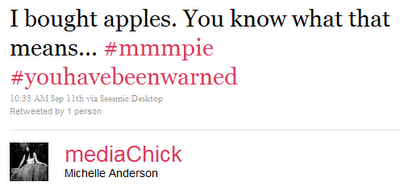 In the meantime, in case you missed it, I made apple pie last weekend. I announced I'd be baking this pie in a status update to Twitter and Facebook: