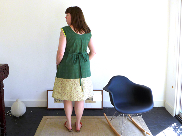 So after all that sleeve nonsense, I ended up trimming off the sleeves all together. And yet, as you can see in the photos, they still go beyond my shoulders. I cut off 3 1/2" at the widest point of the shoulder, and turned it more into a tank. At this point I had to selvage the sleeves, so I simply sewed up the side seams of the dress and bound the armholes in bias binding. I thought I'd roll with the neon binding I already had going to give it a little bit of a pop.