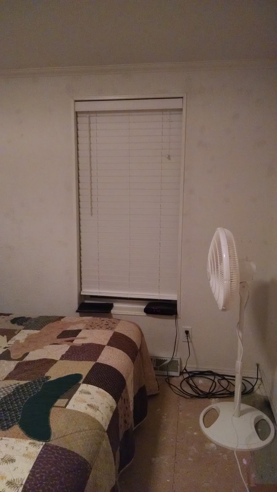 After that, I took down the curtain rod in the bedroom, patched those holes and took the Roman shade down too so I can paint around it without dripping on the shade (which I have always loved more than any other window covering). Once that was done, I emptied our nightstands and cleaned them so I can sand them and stain them tomorrow (including removing all the metalwork to be spray-painted). Then I moved all the dressers out from the wall so I could get all the dust bunnies who've taken up residence since we moved in (the last time I cleaned the cobwebs from the corners of the ceiling). I also cleaned the ceiling fan before vacuuming. I was even feeling adventurous enough to wash windows and the trim around them (inside and out, including the gunk in the window tracks).