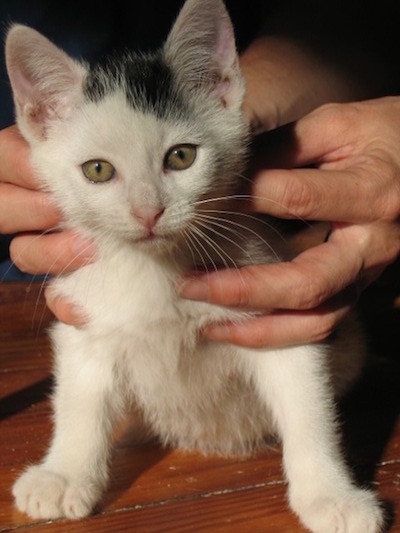 Meet Number Three, the boldest of a litter of three spotted white cats we rescued, named for the three black spots on his back. Number Three was pure bravado. He might have been a feral kitten the first time I spotted him in the neighbor’s backyard when he was just a month old, but he was so full of curiosity that he didn’t run off and hide. Instead, he cocked his oversized head to the left, put one careful paw in front of the other as if he was still learning to defy gravity with baby steps, and started walking towards me, his small white chest out, his golden eyes never leaving me.