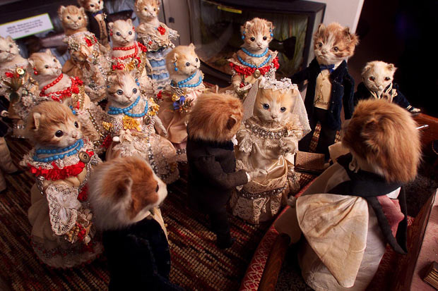 Detail from Walter Potter's "The Kittens Wedding"A typical example is the work of Walter Potter, an hotelier by day and a taxidermist by night (he ran a hotel in Sussex and used his wages to finance his hobby.) He started small by stuffing birds and worked his way up to large-scale scenes depicting animals engaged in human activities. His tableaus may seem bizarre (and even repulsive) to modern tastes but at the height of his popularity Potter’s scenes attracted 30,000 visits a year. It was the human-like qualities of the stuffed animals which made them so popular, of which perhaps one of his best known exhibits was “The Kitten’s Wedding”. (Sold in 2003 for £21,150!)