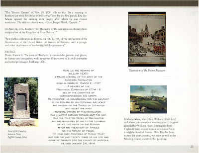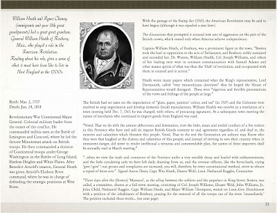Between June and December 2011, I spent a lot of time looking into our family history. I wanted to give my mother, sisters, husband, and sons scrapbooks with information about their ancestors. These first pages are taken from the scrapbook I made for my children. Gen. William Heath is their uncle, seven generations back. Also, Silas Phelps (1720-1816, 6 gg); Eliphalet Phelps (1743-?, 5gg, Captain Forward's company); Eleazer Heath (1756-1850, 5gg, "Continental Line"), and Joseph Heath (1758-1836, 5 gg) fought in the various state militias in the Revolutionary War.