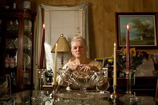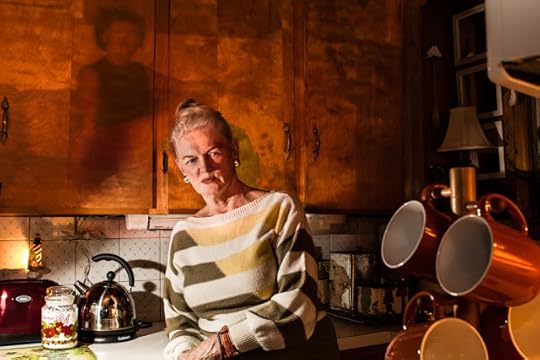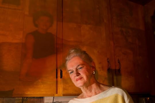 In this photo, the image of her younger self sitting on a couch in Happyland has been projected onto her kitchen cabinets. The cups are orange for the Thanksgiving season.