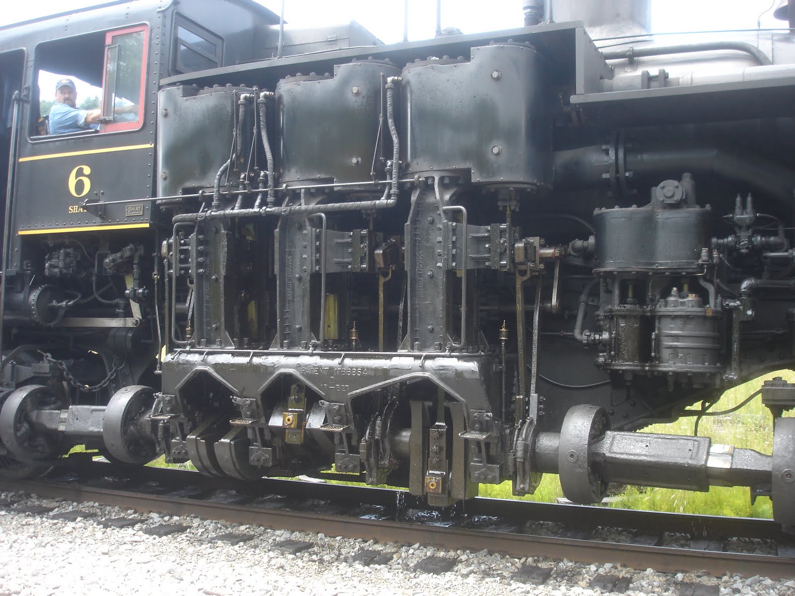 An incredibly complicated machine, it had a boiler and a cab, but other than that it bore no resemblance to the usual steam locomotives. There are three exposed steam cylinders on each side and the cylinders drive a long crankshaft along the lower right side of the unit. This crankshaft drives gears at each of the six wheels, including two beneath the tender. Since the six wheels are rigidly connected to axles and the wheels on the other side, technically it is a 'twelve wheel drive' machine. It is the locomotive equivalent of 'all wheel drive', which was necessary to negotiate the steep grades encountered while climbing the mountains where logging operations were being conducted. As I studied it, I began to realize what an absolute marvel it is that something like this could still be in regular service after all those years. Unlike the relatively smoke-free diesel, a steady cloud of black coal smoke chugged from the stack while water leaked from the botton and steam hissed from relief valves. It was both frightening and strangly magnetic at the same time. It was like staring at a bomb with the strange compulsion to see what that large red button does.