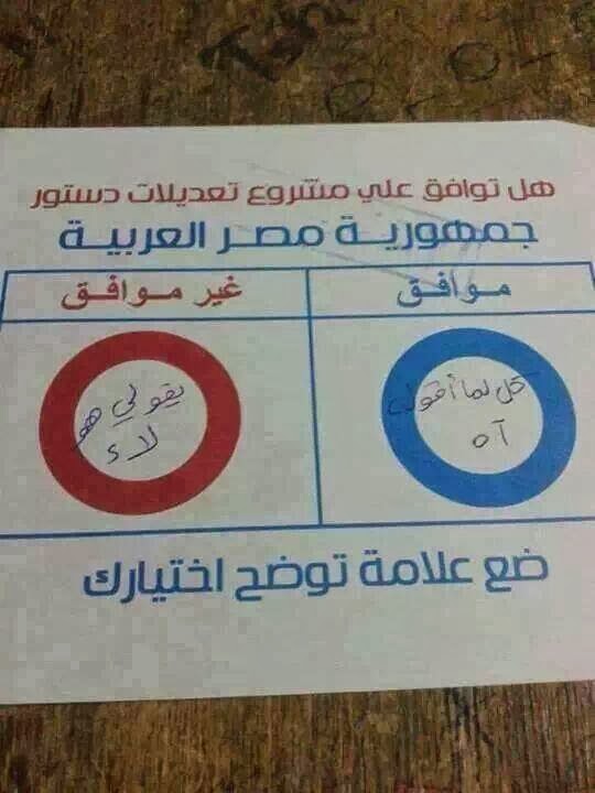 بس ده الاستفتاء الاول في تاريخ البشرية اللي بيتقبض فيه على اللي بيصوت بلا مع ان لا مكتوبة في البطاقة.. يعني لو التصويت بلا عيب او خيانة... كاتبينه ليه في البوطاقة؟ عاملين كمين للخونة