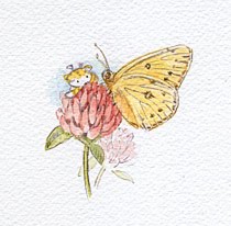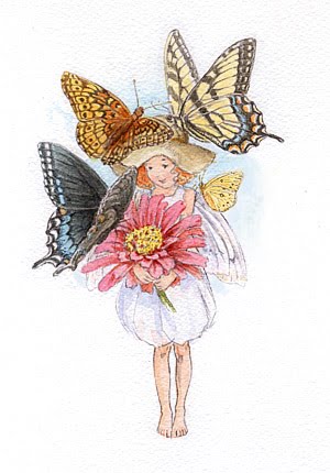 Anthea and Marigold greet each and every new butterfly in the meadow. Here, the black swallowtail visits one of Anthea’s zinnias while the Great Spangled Fritilary tests his wings. An Eastern Tiger Swallowtail rests upon her hat and of course, she is old friends with the yellow sulphur who sits merrily on her shoulder.