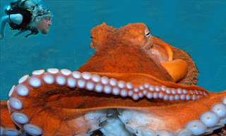 KS:  I guess me and ole Lovecraft share a mutual terror of underwater predators. When I was like 14, I went on vacation to see my aunt up in Seattle. She took me to Puget Sound and made me swim in this shitty little roped off section of the ocean next to a big dock. I kept diving off the thing in stark terror thinking a shark was going to snatch me right out of the air. I mean what the fuck are the ropes for? It's not like they're keeping any giant crazy monsters out. So I get home and I've got a Guinness book of world records that I liked to look at. So I'm going through it and I see world's largest octopus. Guess where they caught it? Puget Fucking Sound. I've never gone back in the ocean again. An artists interpretation of Kevin's fateful meeting with the "Puget Sound 'Puss"