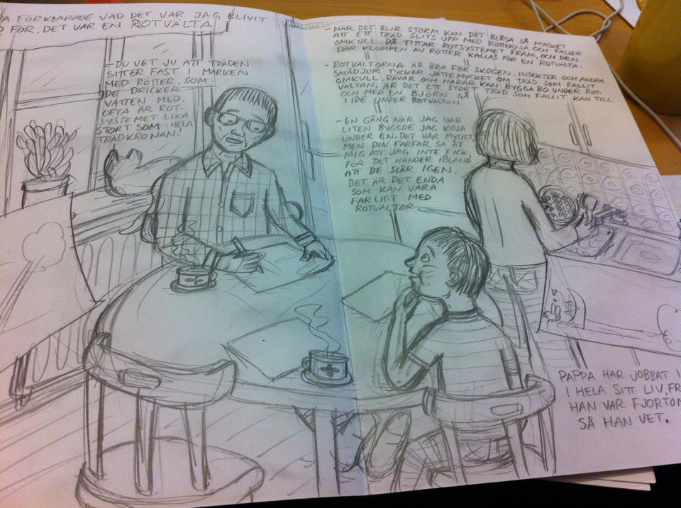 Nu ska ni få höra vad det är jag pysslat med under hösten, när jag inte arbetat med Galago eller haft fullt upp med att inte uppdatera blogg'n.Men vi börjar med att hoppa tillbaka i tiden till mars 2012, när jag besökte Littfest i Umeå och deltog i ett panelsamtal om barnböcker. Jag medverkade främst i egenskap av förälder, men mitt i samtalet började den välbekanta barnboksförfattaren Anna-Clara Tidholm uppmana mig att göra en barnbok. Detta fortsatte hon med i korridoren efteråt, och under dagarna därpå började jag fundera på saken. A-C T:s främsta argument var hur hon uppskattat barnperspektivet i Pojken i skogen, och under mitt grunnande kom jag fram till att, ja... det kanske skulle kunna bli något. Kanske en serie rikt illustrerade självbiografiska barnböcker med ett aldrig sviktande barnperspektiv? Som utspelar sig i samma värld som just Pojken i skogen, men riktar sig till barn i lågstadieåldern istället för till vuxna? Och få chansen att berätta mer om den där barndomen som jag inte känner mig riktigt klar med?
