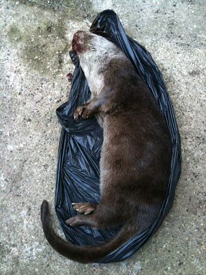 I came home knowing about a new stretch of river, and beyond the poetry, I was thrilled at finding otters there. Each new set of paw prints had revealed something more of the river and of the otter's secret life. The prints had shown that there were cubs, and that there had been some play amongst the pebbles and reedy banks, as well as the busy feeding routine. My mind was full of images of the mingling of wild water and whiskers, of webs and wet fur. But back at home, on opening my emails, I was faced with the shock of this image sent from a friend who lives close by the Teign; an otter had been found still warm, knocked by a car. A young female. She could have been the very maker of those traces of footfall and play that I had just seen in the sand: