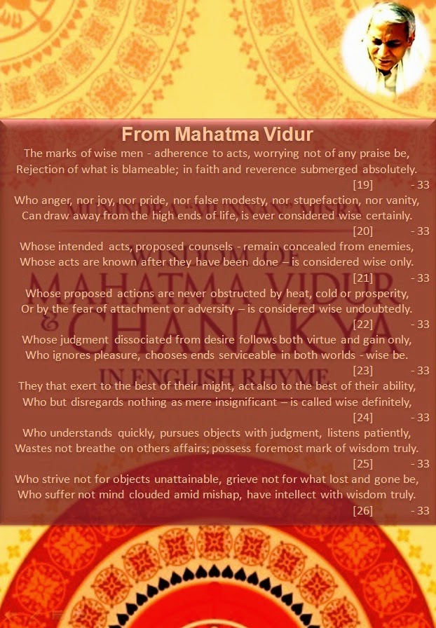 ‘Sleeplessness overtakes a thief, the lustful, who loses all his wealth surely, Who fails to achieve success, is weak and is attacked by the strong clearly.[11] - 33 (Mahatma Vidur)A true friend does not forsake in time of your calamity,In your misfortune, famine, or war, or at death clearly.[12] 1.12 (Chanakya)