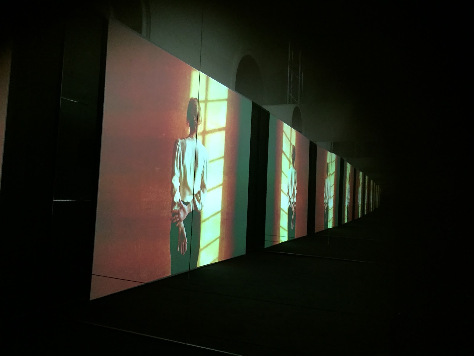 This piece, by Mat Collinshaw, projects the face of a chimp over the image of a skull, all inside a space helmet. It's called Alpha-Omega and is of course a response to 2001. Beyond this subtle beginning to the show, you enter this corridor, which fans of The Shining will appreciate: