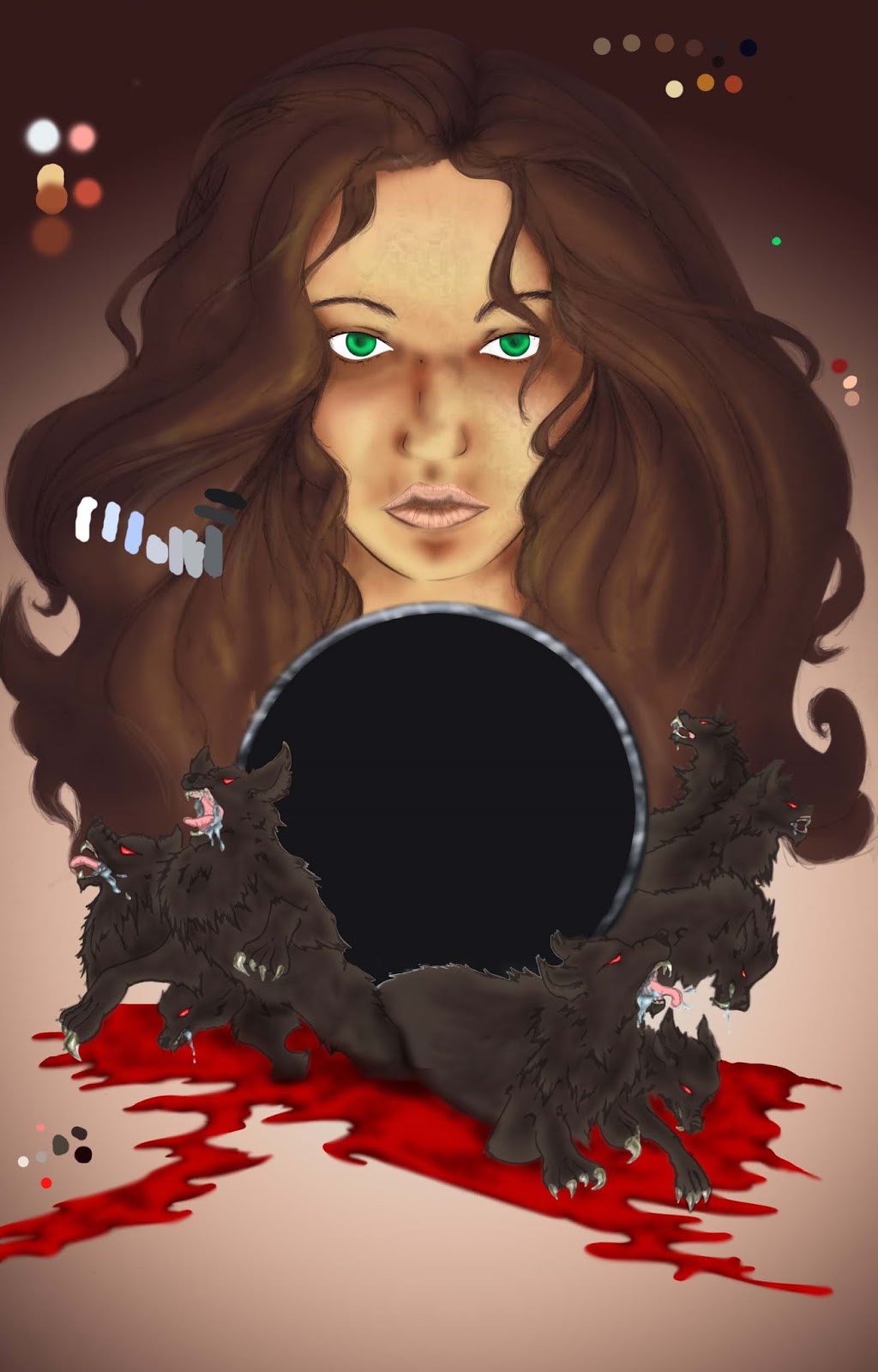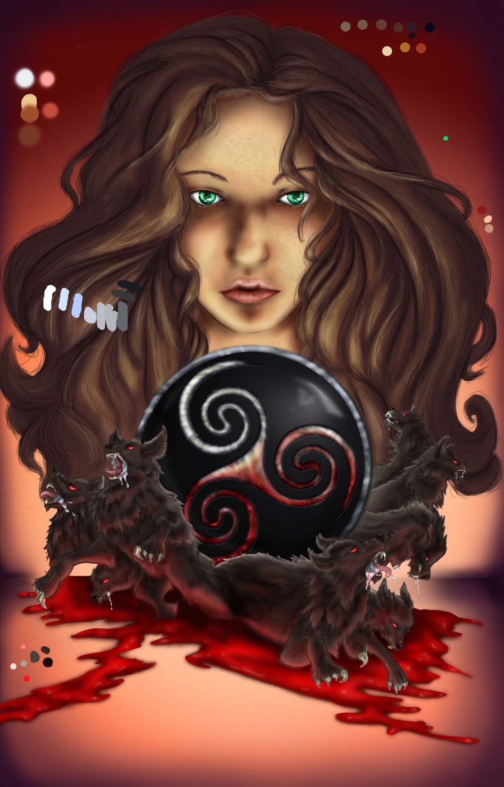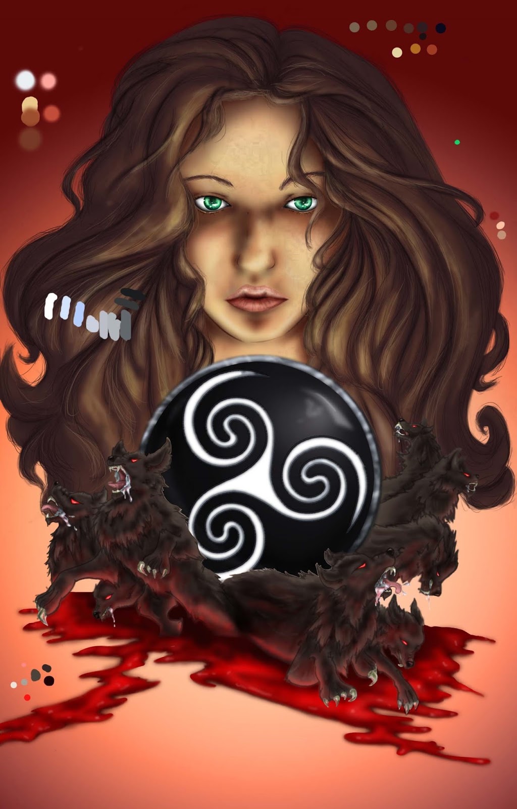 Step 9:Joey: Cover is nearly complete, after 32 hours of work the palette samples are removed. An effect is added on the pendant, and last touches are added. It’s really come a long way.