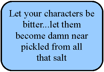 Instead of always glossing over wrongful events done to protagonists, why not use them instead? Let your character be bitter, let them stew in it. What the hell, let them become damn near pickled from all that salt, because when things change for them (if they do) and they have a reason to no longer feel bad, the prize will be so much better. What's a bigger win? Happiness after meh resignation, or happiness after bitter rage? All of us writers know that the bigger the obstacle, the greater the happy ending, and bitterness is one of the greatest internal obstacles available to us.