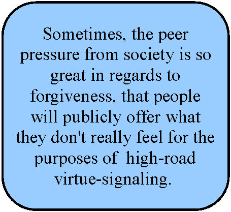 The last is where forgiveness dives down the slippery slide of being an outright lie. Anyone who believes that saying "I forgive you" out loud is a pure mirror of how the person saying it really feels inside, is kidding themselves. Verbally issuing forgiveness is not always for the victim's benefit. It's for the antagonist or for their mutual friends who no longer want to deal with the situation. Sometimes, the peer pressure from society is so great in regards to forgiveness, that people will publicly offer what they don't really feel for the purposes of virtue-signaling. [It should be noted that while virtue signaling is a relatively new term, and is often used derisively toward the progressive left, the act itself has always existed. If you've ever spent much time in an evangelical church, you'll know that virtue signalling is a universal group trait, though it used to be called being sanctimonious.]